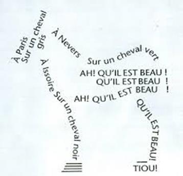 Un calligramme est un poème dont la disposition graphique sur la page forme un dessin, généralement en rapport avec le sujet du texte, mais il arrive que la forme apporte un sens qui s′oppose au texte. Cela permet d′allier l′imagination visuelle à celle portée par les mots | ||